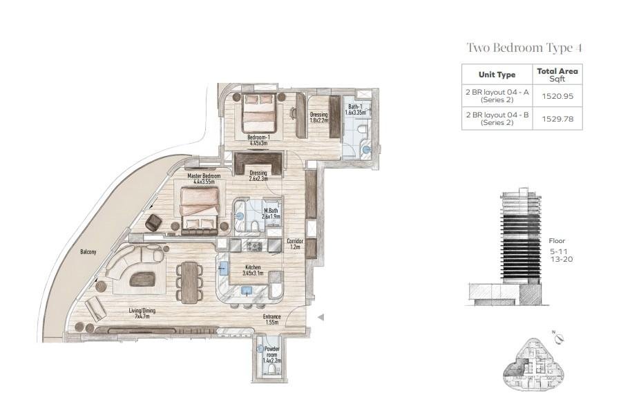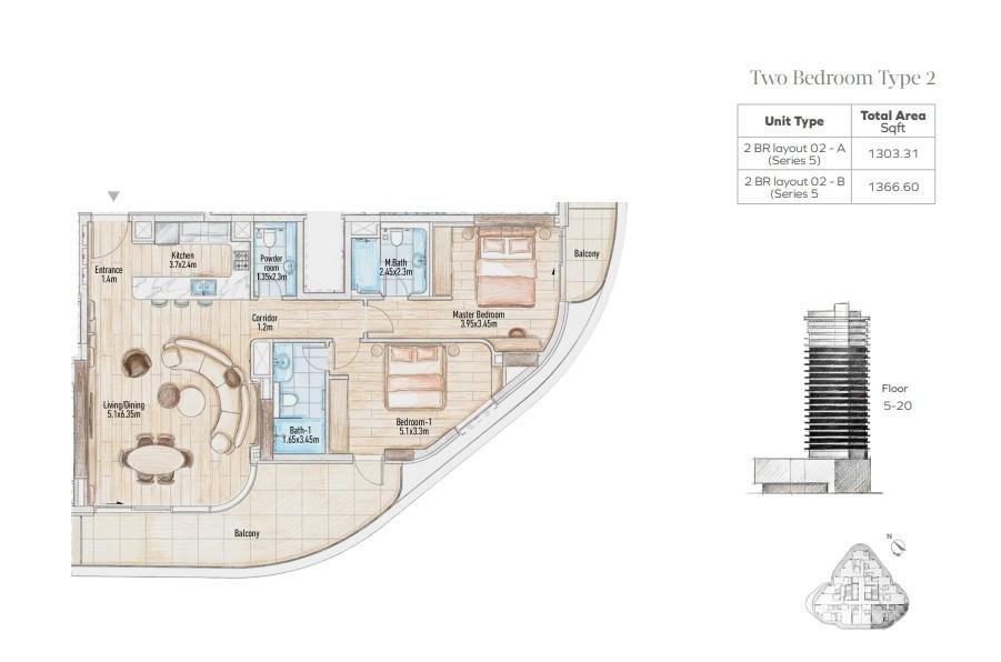 - 2 Bedroom Residences – 1,303–1,634 sq ft